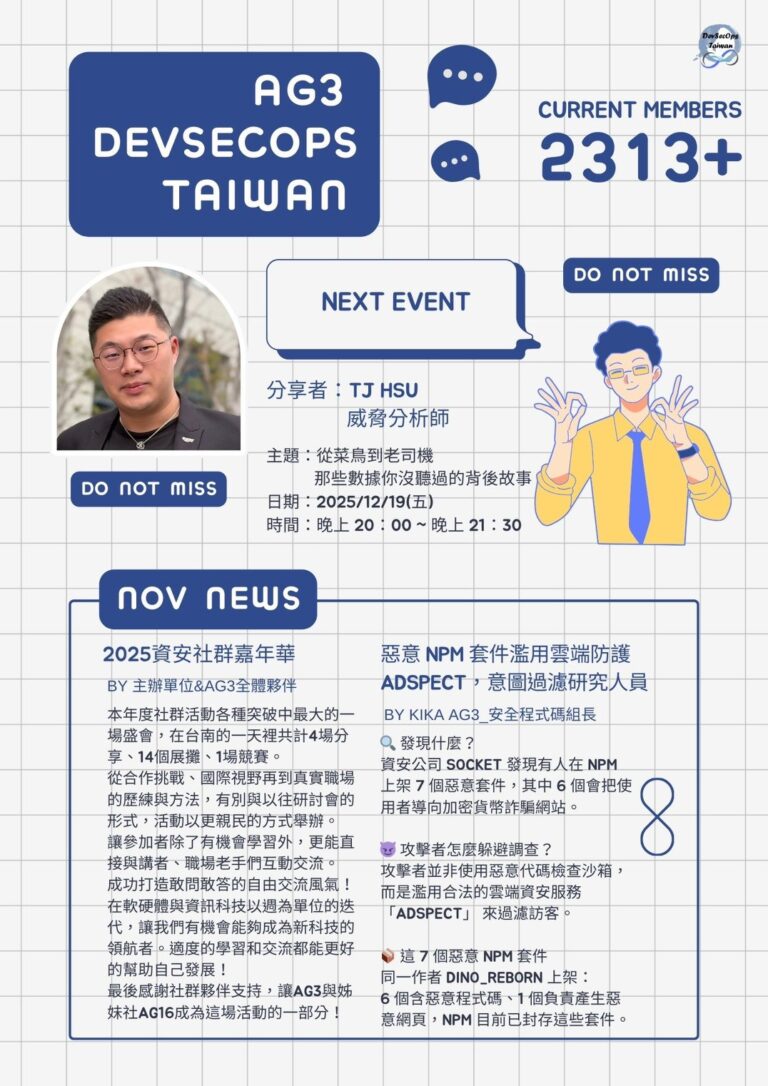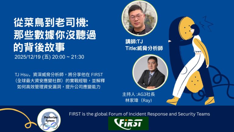 從菜鳥到老司機那些數據你沒聽過的背後故事_TJ Hsu / 2025年12月19日作者: DevSecOps Taiwan / 2025 年 12 月 19 日 「資安漏洞處理,是不是讓你常常覺得孤軍奮戰,像個菜鳥㇐樣手足無措,我將帶你從我的親身經歷出發,揭開那些你可能沒聽過的『數據』背後的故事,聽聽從菜鳥晉升為老司機的故事!我將帶大家㇐起探索全球最大的資安事件應變組織社群 FIRST。除了新聞,更是連結國際資安團隊、共享威脅情資、提升能力管道。想知道怎麼加入?加入後能跟誰㇐起打怪?這裡通通告訴你。是否曾為CVE處理感到頭痛?從產品供應商角度,分享析加入 CNA (CVE Numbering Authority) Project 對組織的影響。從接收漏洞、處理流程、到如何掌握 CVE 編號主導權,讓你的漏洞管理從被動變主動,效率與透明度瞬間飆升,更能強化你在資安生態系中的責任與公信力。最後在聊聊如何快速讀懂 CVE Record 和 Vendor Security Advisory 的眉角,讓你不再被㇐堆編號和術語搞得頭昏腦脹。讓你的資安之路不再孤單!